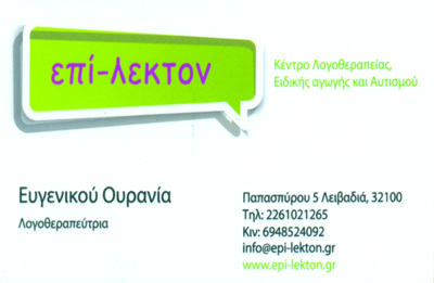 Ευγενικού Ουρανία: ΛογοθεραπεύτριαΕυγενικού Ελένη: Ειδική ΠαιδαγωγόςΚέντρο Λογοθεραπείας, Ειδικής Αγωγής και ΑυτισμούΣυμβουλευτική ΓονέωνΛογοθεραπεία - ΕργοθεραπείαΚαθημερινά με ραντεβού