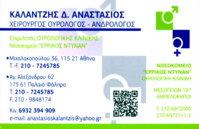 Χειρουργός Ουρολόγος - Ανδρολόγος FEBU Επιμελητής Ουρολογικής Κλινικής Νοσοκομείου "ΕΡΡΙΚΟΣ ΝΤΥΝΑΝ"Μέλος της Ευρωπαϊκής Ουρολογικής Εταιρίας (EAU)Μέλος της Ευρωπαϊκής Ενδοουρολογικής ΕταιρίαςΛέξεις Αναζήτησης: Χειρουργική Ογκολογία Ανδρολογία Γυναικολογική Ουρολογία Παιδοουρολογία Νευροουρολογία.Καρκίνος προστάτη Ακράτεια ούρων Ανδρική Υπογονιμότητα Μεγέθυνση πέους ή αυξητική φαλλοπλαστικήΣτένωση ουρήθρας Υπερτροφία προστάτη Σεξουαλική δυσλειτουργίαΑιματουρία Φίμωση Φαλλοπλαστική Κιρσοκήλη Λιθίαση ουροποιητικού Στυτική δυσλειτουργίαΗλεκτρομυογραφία σηραγγωδών σωμάτων πέους Βιοψία προστάτηΈρπης γεννητικών οργάνων Θηλώματα Καλλιέργεια ούρων Καρκίνος κύστης Καρκίνος όρχεως Καρκίνος πέουςΚαρκίνος προστάτη Κυστεοσκόπηση Κυστίτιδα Ορχεοεπιδιδυμίτιδα Ουρηθρίτιδα Ουροδυναμικός έλεγχοςΟυροκαλλιέργειαΟυρολοίμωξη Προστάτης αδένας Προστατίτιδα Πρόωρη εκσπερμάτιση Συστροφήόρχεως Υδροκήλη Υπερπλασία προστάτη αδένα.Κατόπιν ραντεβού.