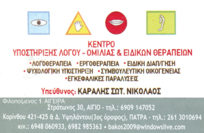 Εξειδίκευση σε εγκεφαλική παράλυση.Καθημερινώς κατόπιν ραντεβού.2η Διεύθυνση: Στρατώνος 30, Αίγιο3η ΔΙεύθυνση: Φιλοποιμένος 1, Αιγείρα