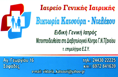 Ειδική Γενική ΙατρόςΜετεκπαιδευθείσα στο Διαβητολογικό Κέντρο Γ.Ν. Τζάνειου, Τέως Επιμελήτρια Ε.Σ.Υ.Δευτέρα εώς Παρασκευή κατόπιν ραντεβού.2ο ΙΑΤΡΕΙΟ:Αγ. Γεωργίου 16 (Πρώην Ιατρείο Χ. Γκίκα - έναντι ΚΤΕΛ), Σοφάδες, ΚαρδίτσαΤηλέφωνο:2443022225