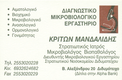 Διευθυντής Μικροβιολογικού Εργαστηρίου Στρατιωτικού Νοσοκομείου ΔιδυμοτείχουΔέχεται καθημερινά μόνο πρωί 07:00-14:00