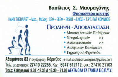Φυσικοθεραπευτής - συμβεβλημένος ΕΟΠΥΥΜSc in Metabolic Diseases of Bones στην Ιατρικη ΑθηνωνΗand Therapist εγγεγραμενος στο τμημα ΑΝΩ ΑΚΡΟΥ της ΕΕΕΦτ. Pt. ΠΑΣ ΚΟΡΙΝΘΟΣ