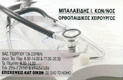 Χειρουργός Ορθοπεδικός - Ιατρικός ΒελονισμόςΔέχεται Δευτέρα - Τετάρτη - Παρασκευή 08:30-14:00 και 17:30-21:00