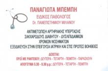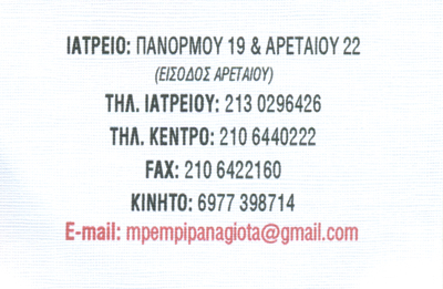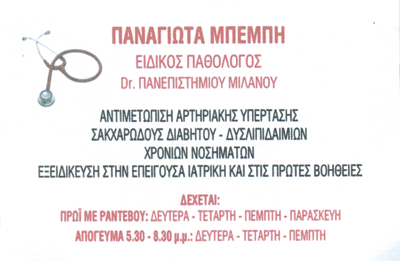 Ειδικός ΠαθολόγοςΔέχεται Δευτ. - Τετ. - Πεμ. και Παρ. πρωί με ραντεβούΔευτ. - Τετ. & Πέμ. απόγευμα επίσης με ραντεβού.