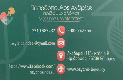 O Ανδρέας Παπαδόπουλος MSc, ψυχολόγος - παιδοψυχολόγος, είναι υπεύθυνος του κέντρου ειδικών θεραπειών «ΨΥΧΟΣΥΝΔΕΣΗ - ΠΑΠΑΔΟΠΟΥΛΟΣ ΑΝΔΡΕΑΣ MSc», στην περιοχή Εύοσμος της Θεσσαλονίκης, και προσφέρει τη δυνατότητα συνεδριών, μέσω Skype σε όλη την Ελλάδα, αλλά και στο εξωτερικό.