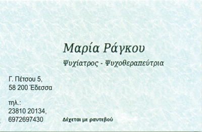 Ωράριο:Δευτέρα - Παρασκευή 10:00 - 13:00 & 17:00 - 21:00κατόπιν ραντεβού