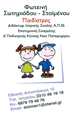 Επιστημονικός Συνεργάτης Α΄Παιδιατρικής κλινικής Νοσοκομείου ΠαπαγεωργίουΔέχεται καθημερινά 18:00 -21:00 με ραντεβού