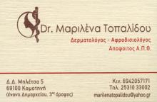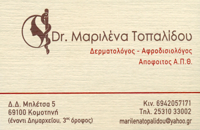 Κλινική Αισθητική ΔερματολογίαΕξειδίκευση στη Δερματοχειρουργική (αφαίρεση σπίλων) & αποτρίχωση με Laser AlexadriteΩράριο: καθημερινά πρωί και απόγευμα με ραντεβούΗΜαριλένα Τοπαλίδου αποφοίτησε από το ΑΠΘ και εξειδικεύτηκε στην ΑΠανεπιστημιακή κλινική Θεσσαλονίκης. Είναι μέλος της ΕλληνικήςΔερματολογικής Εταιρείας, της Ευρωπαικής Εταιρείας Δερματολόγων (EADV),της Ελληνικής εταιρείας Δερματοσκόπησης και της ΕλληνικήςΔερματοχειρουργικής Εταιρείας.Διατηρεί έναν άρτια αισθητικά χώρο,εξοπλισμένο με μηχανήματα τελευταίας τεχνολογίας, όπου μπορεί να σαςπροσφέρει υψηλού επιπέδου υπηρεσίες.