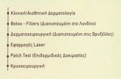 Στοιχεία Αναζήτησης: Αποτριχωση, Botox, Κρυοθεραπεια, Ακμη, ΨωριασηΔέχεται καθημερινά πρωί και απόγευμα με ραντεβού